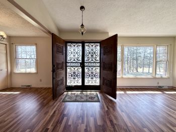 TRACT #1: Offers a 1-owner, 2 to 3 bedroom / 2.5 bath brick house w/ finished basement & attached garage on 2.88 acres, m/l, w/ 32ft x 48ft metal barn. Property offers a beautiful, park-like setting with countryside views outback! This brick house offers 1,945 sq ft +/- of living space on main level, plus an additional 1,354 sq ft +/- in the basement having fireplace, utility room, storage, ½ bath & outside entrance. Main level offers a large living room, kitchen that opens to the great room w/ vaulted ceiling and brick fireplace, formal dining area & office / study. Also, additional all-purpose room off the garage. House has large front and rear patio porches, 2 central heat & air units, huge 2-car garage, blacktop circle drive & storage shed. Come enjoy this beautiful country home.